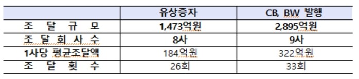 그리고, 한계기업들은 CB·BW 사모발행과 제3자배정 유상증자 등을 해여 자본금 대비 대규모 자금을 반복적으로 조달했다. 2019년 1월~2021년 6월 기간 동안 한계기업 15사 중 12사가 유상증자와 CB·BW 발행 등을 통해 총 4368억원, 1사당 평균 364억원을 조달했고, 자금조달 12사의 자본금은 평균 157억원에 달했다. 8개사는 유상증자로 26회에 걸쳐 1473억원을, 9사는 CB·BW 발행으로 33회에 걸쳐 2895억원의 자금을 조달했다.
