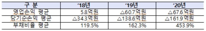 또, 영업손실과 당기순손실 확대, 부채과다 등 재무구조가 부실하다. 한계기업 15사의 2020년 영업손실과 당기순손실 평균은 각각 67억 6000만원과 161억 9000만원으로 적자상태이며, 최근 3년간 지속적으로 악화됐다. 부채비율도 손실누적과 주식관련사채 발행 등으로 인해 최근 3년간 지속적으로 악화되고 있으며 2020년말에는 453.9%까지 급등했다.