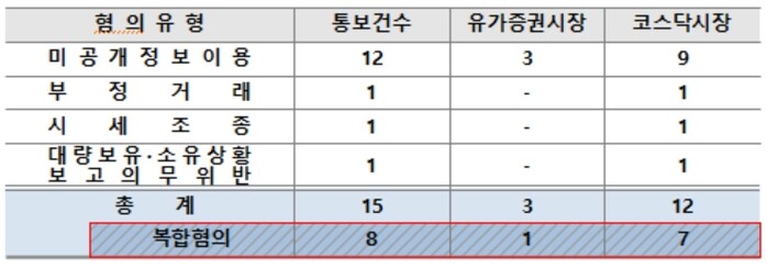이번에 적발된 혐의유형별로는 미공개정보이용 12건, 부정거래 1건, 시세조종 1건, 보고의무 위반 1건이다.