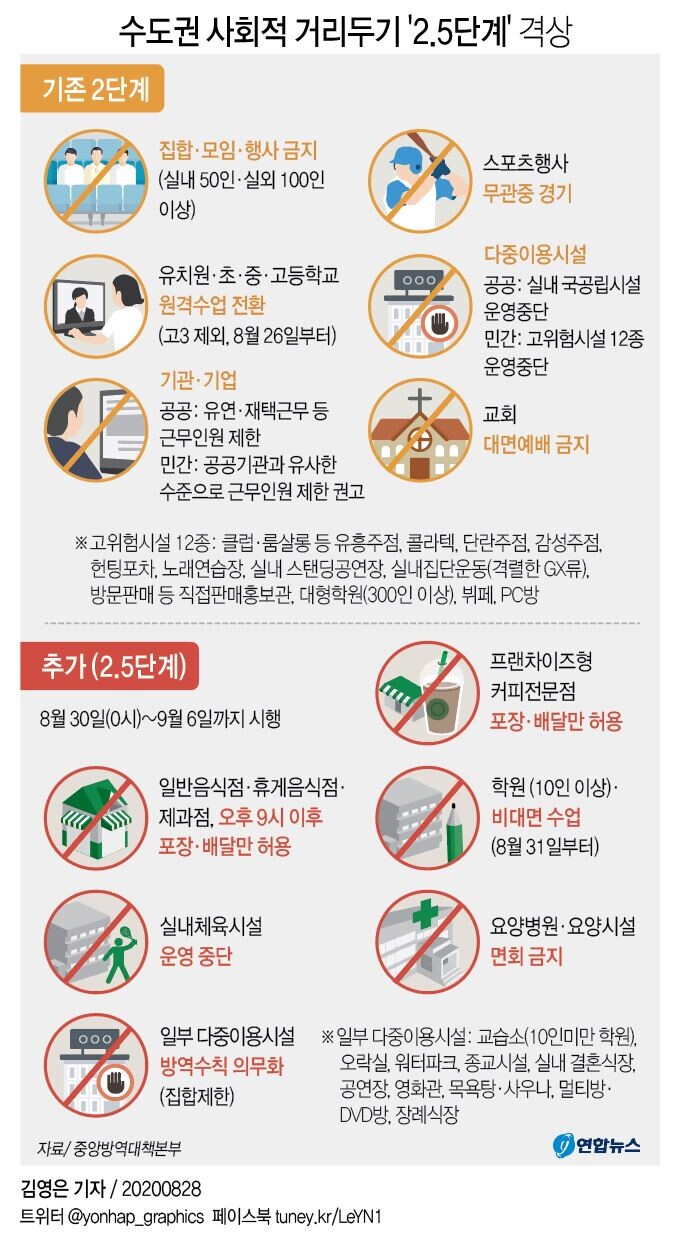 ▲ 수도권 사회적 거리두기 '2.5단계' 격상 주요 실시 내용. [그래픽= 연합뉴스] |