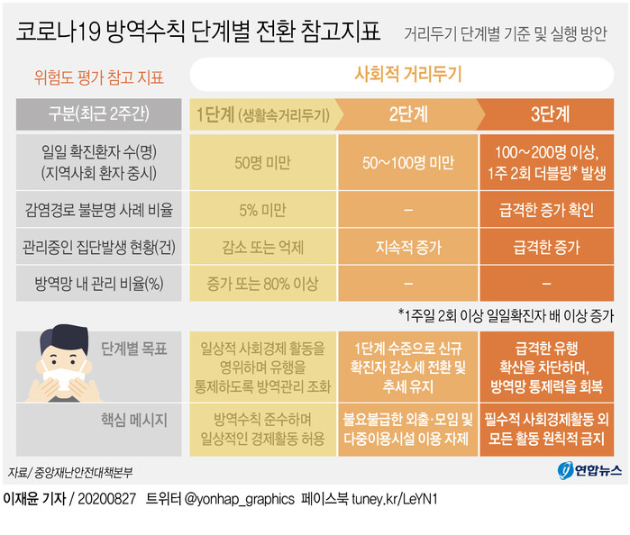 ▲ 코로나19 방역수칙 단계별 전환 참고지표. [그래픽= 연합뉴스] |