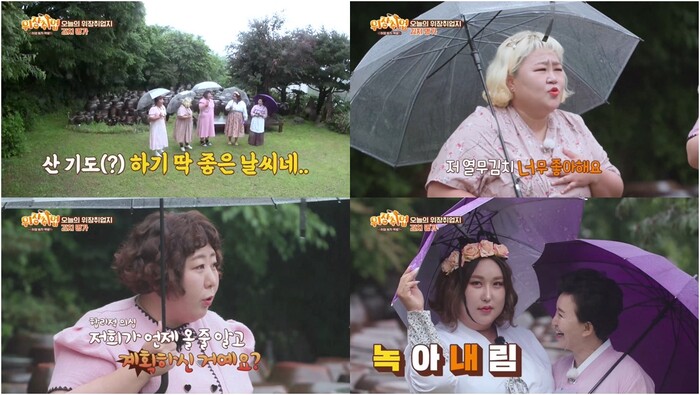 하지만 이내 풍자는 “여기 오기 전 근처 식당에서 아침을 먹었는데, 사장님이 나를 무속인으로 오해하셨다”며 “‘어디에 산 기도 하러 오셨냐’는 말까지 들었다”고 토로해 모두를 빵 터뜨린다. 급기야 풍자는 우천을 대비해 챙겨온 작업용 우산(?)을 펼쳐 보이는데, 고용주의 한복과 똑같은 보라색 우산이어서 “저희 뭐(운명) 있는 거 아니에요?”라고 갑분 ‘운명론’을 설파한다.