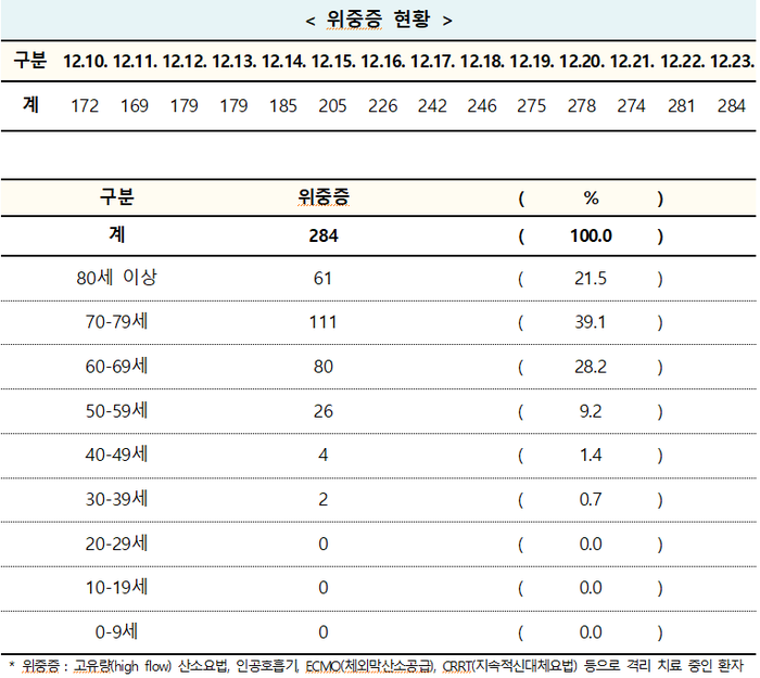 위중증 환자는 전날보다 3명 늘어난 284명으로 여전히 증가 추세다.