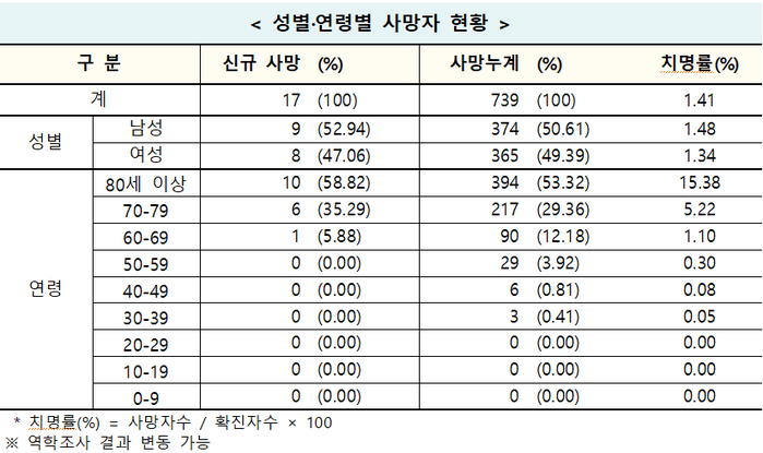 전날 하루 17명이 숨져 누적 사망자는 739명이 됐다. 사망자는 15일(13명)이후 9일째 두 자릿수를 보였다. 이 기간 152명이나 목숨을 잃었다. 국내 평균 치명률은 1.41%다.