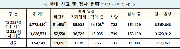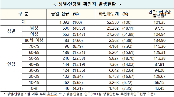 질병관리청 중앙방역대책본부(방대본)는 23일 0시 기준으로 전날 대비 코로나19 신규 확진자가 1092명 추가돼 지금까지 누적 확진자 수는 5만2550명(해외유입 5193명)이라고 밝혔다.