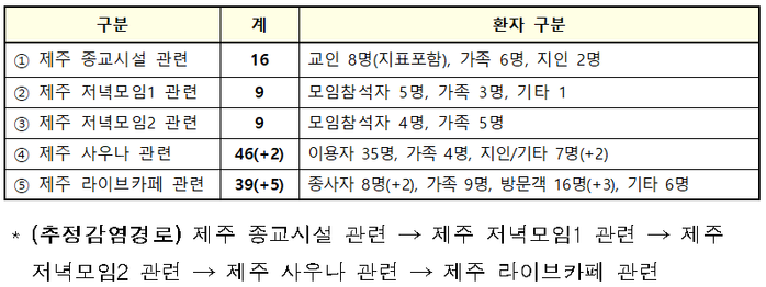 ▲ 23일 0시 기준 제주 제주시 종교시설 관련 코로나19 확진자 현황. [출처= 중앙방역대책본부] |