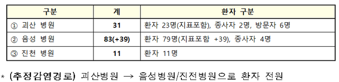 ▲ 충북 괴산군/음성군/진천군 병원 관련 확진자. [출처= 중앙방역대책본부] |