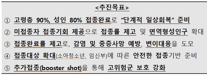 ▲ 코로나19 예방접종 시기별 접종 목표. [코로나19 예방접종대응추진단 제공] |