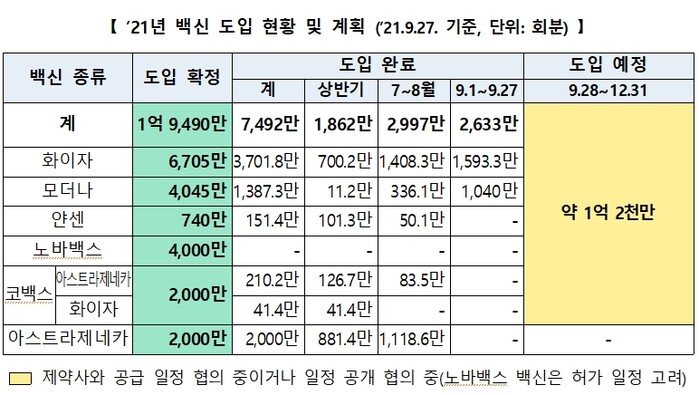 ▲ 2021년 백신 도입 현황 및 계획. [코로나19 예방접종대응추진단 제공] |