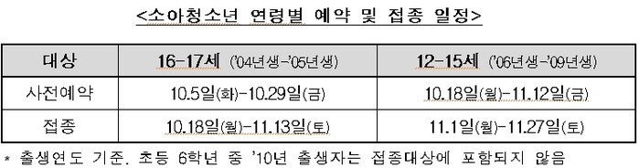 16~17세(2004~2005년생)는 10월 5일부터 10월 29일까지 사전예약을 실시하고, 10월 18일부터 11월 13일까지 접종하고, 12~15세(2006~2009년생)의 경우는 예약과 접종 일정이 각각 2주 뒤에 시작된다.