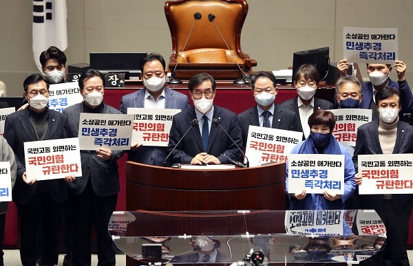 연합뉴스에 따르면, 민주당은 이날 오전 2시 8분께 단독으로 예결위 전체회의를 열고 자영업자·소상공인 320만명에게 방역지원금을 300만원씩 지급하는 내용을 골자로 하는 14조원 규모의 정부 추경안을 처리했다. 예결위 회의 개회 후 정부 추경안이 처리되기까지는 총 4분이 걸렸다.
