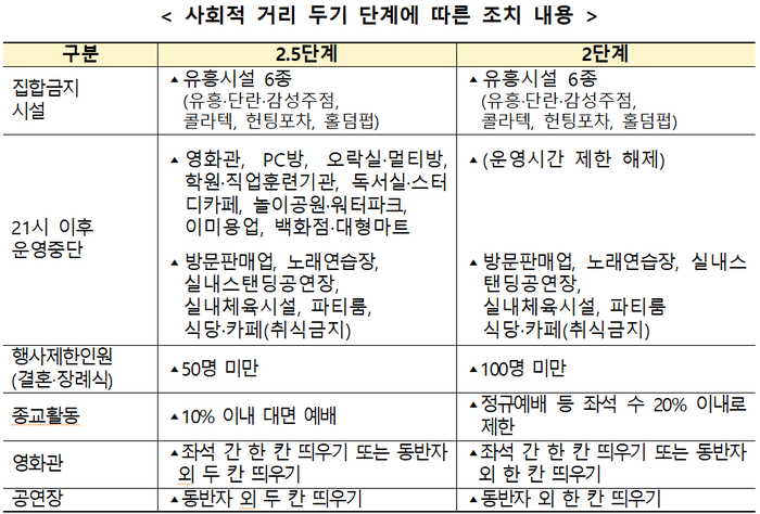 공연장과 영화관에서는 그동안 집단감염이 발생하지 않았고 마스크를 상시적으로 착용할 수 있다는 점을 고려해 1.5단계와 2단계에서는 개인 기준이 아니라 동반자까지를 기준으로 좌석을 한 칸 띄우도록 했다. 2.5단계에서는 동반자 외에 좌석을 두 칸씩 띄우기로 조정했다.