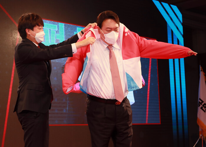 ▲ 국민의힘 이준석 대표가 윤석열 대선후보에게 당 점퍼를 입혀주고 있다. [국회사진기자단=연합뉴스] |