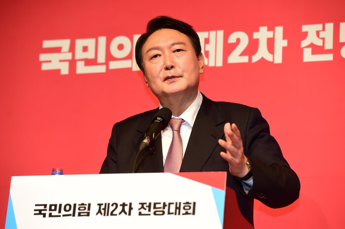 ▲ 국민의힘 윤석열 대선 후보가 5일 오후 서울 용산구 백범김구기념관에서 열린 제2차 전당대회에서 제20대 대통령 선거 후보에 선출된 후 기자회견을 하고 있다. [국회사진기자단=연합뉴스] |
