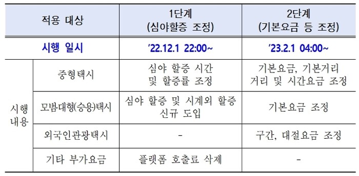 우선, 12월 1일 오후 10시부터 중형택시와 모범‧대형(승용)택시의 심야할증을 조정‧시행한다.