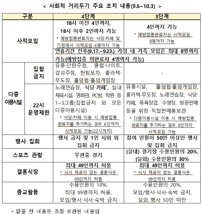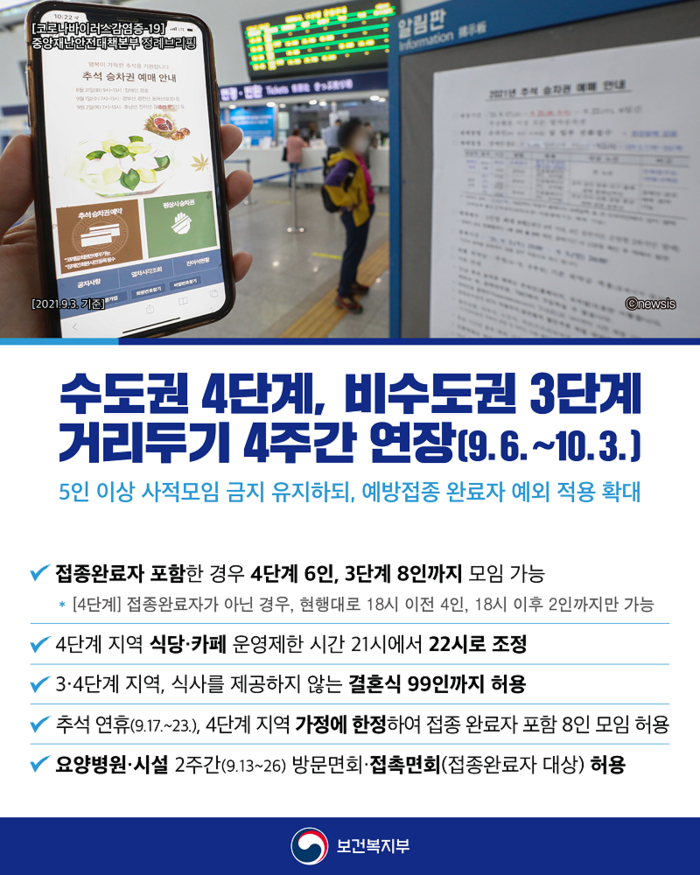 현재 적용중인 사회적 거리두기 단계(수도권 4단계, 비수도권 3단계)와 비수도권 5인 이상 사적모임 금지조치가 오는 6일 0시부터 다음달 3일 자정까지 4주간 연장된다. 추석 연휴와 이로 인한 여파를 평가하기 위해 통상적인 2주 연장보다 더 길게 설정됐다.
