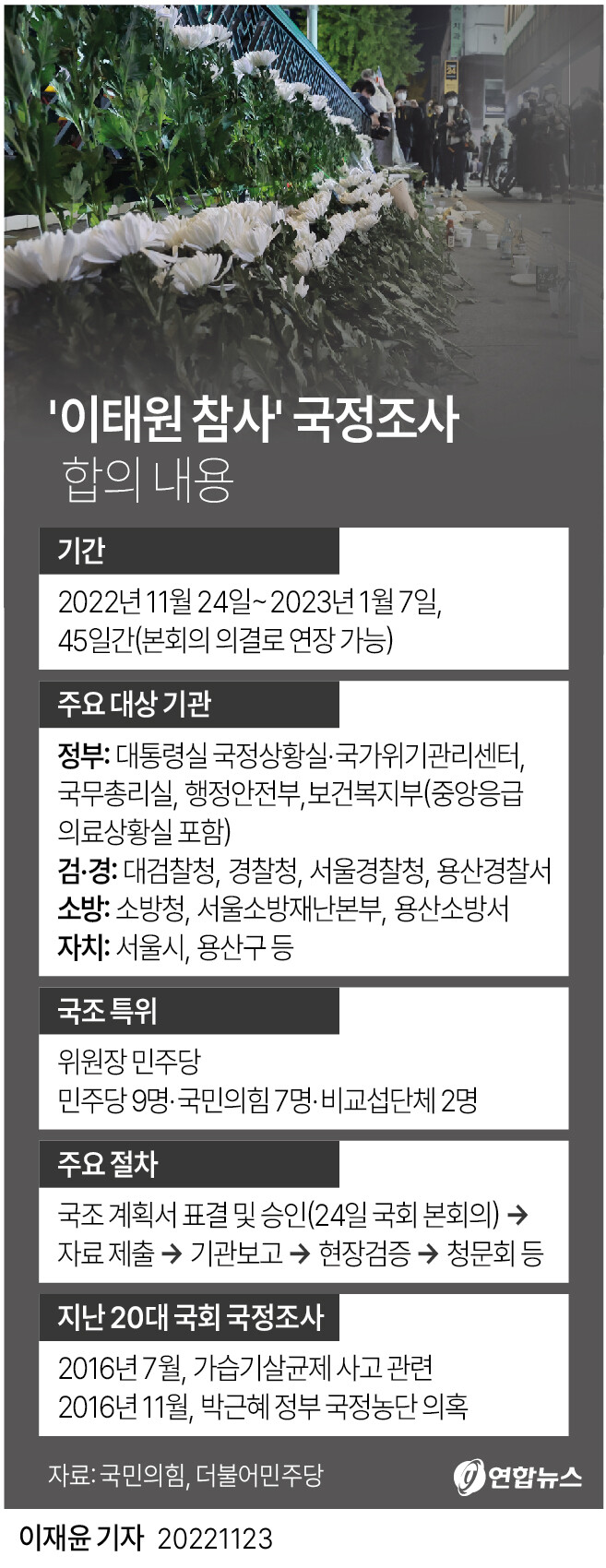 여야가 ‘이태원 압사 참사’와 관련한 국정조사 협상에 전격 타결지었다. 이에 따라 24일부터 준비기간을 거쳐 예산안 처리 직후 국정조사가 본격 실시된다.