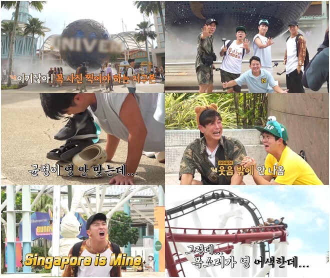 이날 싱가포르 창이공항에 도착한 ‘독박즈’는 밀림처럼 울창한 실내 조경에 탄성을 내지른다. 김대희는 “공항에 밀림이 있네”라며 동공대확장을 일으키고, 김준호는 “완전 ‘아바타’다~”라며 원숭이 울음 흉내를 낸다. 흥분된 분위기 속, 막내 홍인규는 “예전에 유니버셜 스튜디오를 아이들과 갔었는데 너무 좋았다”며 첫 번째 여행 코스를 추천하고, 유세윤도 “유니버셜 스튜디오 가자!”라고 호응한다.