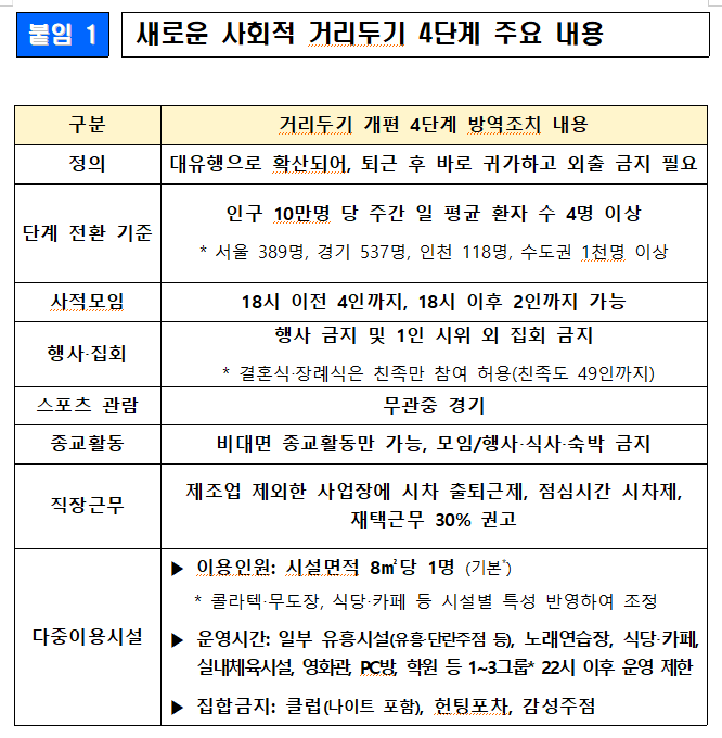 ▲ 새로운 사회적 거리두기 4단계 주요 내용. [출처=중앙재난안전대책본부] |