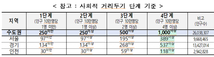 ▲ 사회적 거리두기 단계 기준. [출처=중앙재난안전대책본부] |
