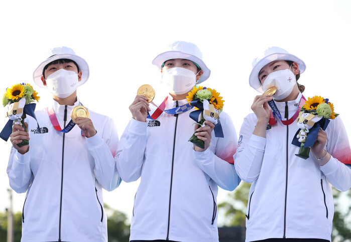 | ▲ 25일 일본 도쿄 유메노시마 공원 양궁장에서 열린 양궁 여자단체전 결승전에서 금메달을 차지한 안산, 장민희, 강채영이 메달을 들고 포즈를 취하고 있다. [도쿄=연합뉴스] |