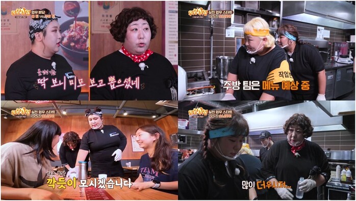 드디어 업무에 투입된 4인방은 각자 맡은 자리에서 열일 모드에 돌입한다. 이때 첫 손님이 입장하자 홀 팀 신기루는 “어서옵쇼”라며 다소 부담스러운 응대로 고용주의 호출을 받는다. 결국 연행된(?) 신기루와 풍자는 “저희가 영업을 하려고..”라고 나름의 변명을 늘어놓는다.