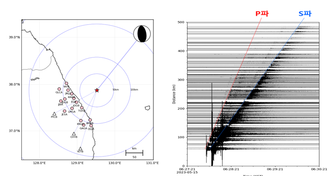 ▲ 15일 동해에서 발생한 규모 4.5 지진의 정보 분석에 사용된 관측소(왼쪽)와 이번 지진의 발생위치로부터 거리에 따른 지진파의 전파 양상. [출처=기상청] |