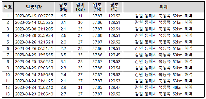 4월 23일 이후 같은 해역 진앙 5㎞ 이내서 규모 2.0 이상 13회 발생