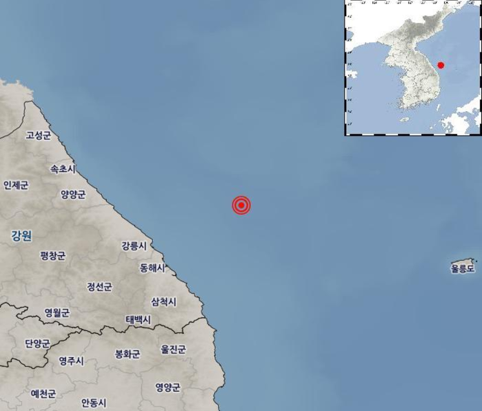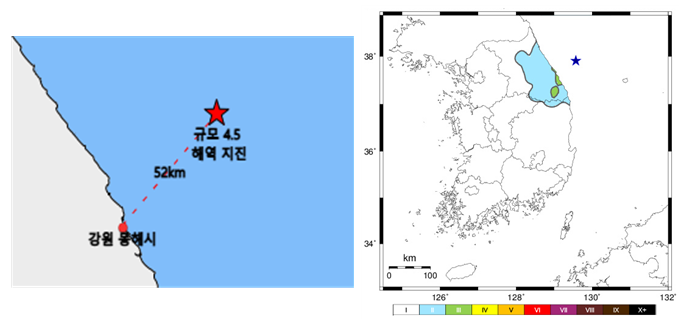 기상청에 따르면, 15일 오전 6시 27분 37초에 강원 동해시 북동쪽 52㎞ 해역(북위 37.87도‧동경 129.52도)에서 규모 4.5 지진이 발생했다. 진원의 깊이는 31㎞로 추정됐다.