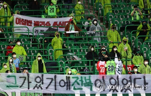 ▲ 1일 오후 전북 전주월드컵경기장에서 열린 이동국 은퇴식에서 관중석에 이동국 유니폼 및 응원 현수막이 걸려 있다. [전주= 연합뉴스] |