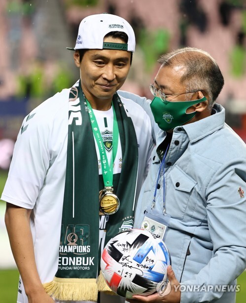 ▲ 전북 이동국이 1일 오후 전북 전주월드컵경기장에서 정의선 현대자동차 그룹 회장에게 우승 기념 사인볼을 선물한 후 기념촬영을 하고 있다. [전주= 연합뉴스] |