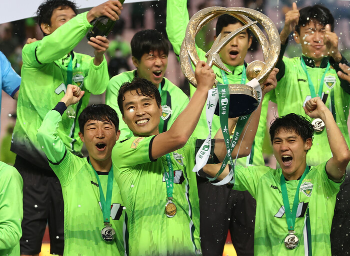 제주, K리그2 우승...강등 한 시즌 만에 와신상담 끝내고 1부리그 복귀 [메가경제= 류수근 기자] 전북 현대가 프로축구 역사에 전인미답의 기록을 썼다. 그 자리에는 ‘라이언킹’ 이동국이 마지막으로 함께 뛰어 역사적인 의미를 더했다.