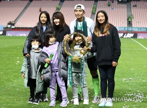 ▲ 전북 이동국이 1일 오후 전북 전주월드컵경기장에서 열린 은퇴식을 마친 후 가족들과 기념촬영을 하고 있다. [전주= 연합뉴스] |