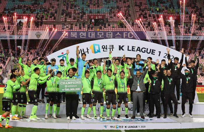 전북은 후반 막판 수비를 잔뜩 끌어내려 대구의 막판 공세를 막아내며 K리그 '최초 4연패·최다 8회 우승'의 금자탑을 완성했다.
