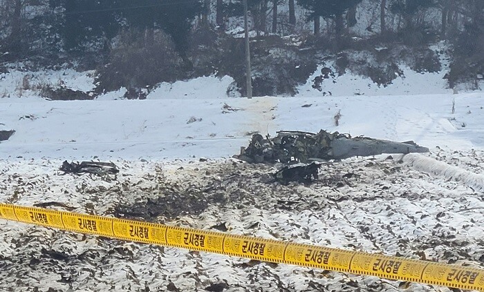 ▲ 26일 오전 11시 40분께 강원 횡성군 횡성읍 묵계리에서 공군 KA-1 경공격기가 추락해 군 당국이 수습하고 있다. 조종사 A(27)씨와 B(25)씨 등 2명은 무사히 비상 탈출해 소방당국에 의해 이송됐으며, 의식이 명료한 것으로 전해졌다. [횡성=연합뉴스] |