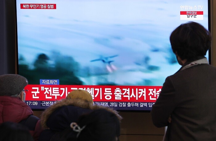 ▲ 26일 서울역 대합실에서 시민들이 북한 무인기 영공 침범과 관련된 뉴스를 시청하고 있다. [서울=연합뉴스] |