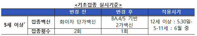 ▲ 5월 30일부터 기초접종 미완료자에 대한 접종기준이 2가백신 1회 접종으로 바뀌었다. 코로나19 백신 접종기준 주요 변경사항. [질병관리청 제공] |