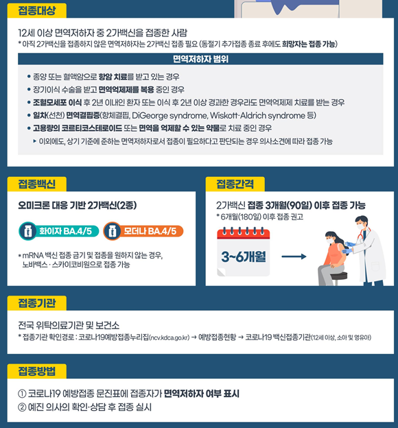 추가접종은 마지막 접종일로부터 3개월(90일) 이후 가능하며, 접종백신은 BA.4/5 기반 2가백신(화이자, 모더나)이다.. 다만 mRNA 백신접종을 원하지 않는 경우, 스카이코비원 등 유전자재조합 백신을 활용할 수 있다.