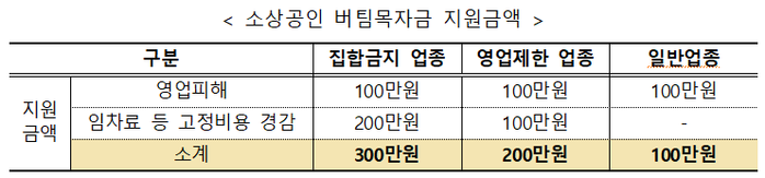 지난해 11월 24일 이후 중앙재난안전대책본부(중대본)와 지자체 방역강화로 집합금지 또는 영업제한된 소상공인이며, 지원금액은 각각 300만원과 200만원이다.