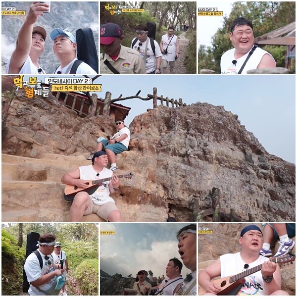 아직도 부글부글 끓고 있는 활화산의 분화구를 바라보던 ‘먹보 형제’는 잠시 ‘말잇못’ 하더니 서울에서부터 매고 온 기타를 꺼내든다. 이어 문세윤은 “그냥 (노래) 한 곡 치고 (기타를) 화산에다 던져버리자”라고 너스레를 떨면서도, 이내 김준현의 기타 연주에 맞춰 완벽하고 두툼한(?) 하모니를 선사해 뚱보 듀오 ‘살색지대’의 탄생을 알린다.