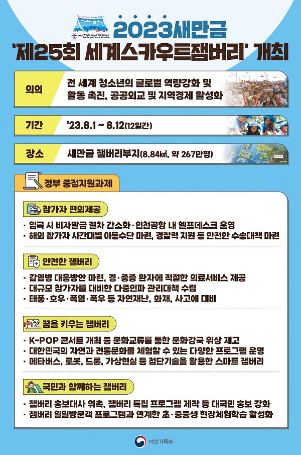 여성가족부는 이번 세계잼버리가 가장 안전한 잼버리로 개최될 수 있도록, 국무총리를 위원장으로 하는 정부지원위원회를 중심으로 행안부, 문체부 등 전 부처가 참여해 위기상황 대응 계획을 마련했다고 밝혔다.