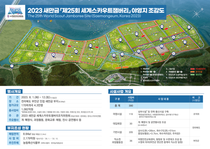 1일부터 12일까지 12일 간 펼쳐질 이번 새만금 세계잼버리는 새만금 부지(약 8.84㎢‧약 267만평)에서 전 세계 158개국 4만3천여 명의 스카우트대원들이 참여한 가운데 열린다.