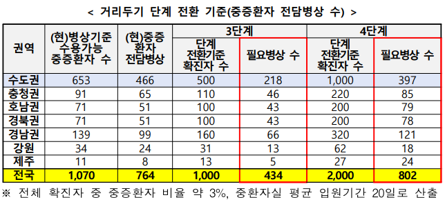 ▲ 거리두기 단계 전환 기준 별 중증환자 전달병상 수. [출처=보건복지부] |