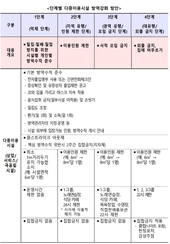 ▲ 단계별 다중이용시설 방역강화 방안. [출처=보건복지부] |