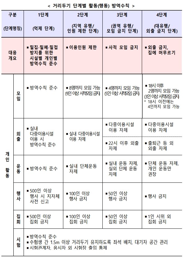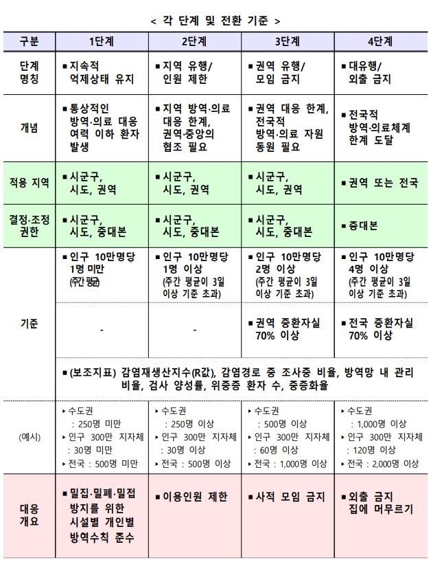 ▲ 1단계는 전국적으로 500명 이하, 수도권은 250명 이하일 때, ▲ 2단계는 전국적으로 500명 이상, 수도권에 250명 이상일 때, ▲ 3단계는 전국적으로 1000명 이상, 수도권에는 500명까지, ▲ 4단계는 전국적으로 2000명 이상의 확진자가 발생하고 수도권에서는 1000명이 기준이 된다.