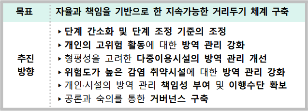 ▲ 사회적 거리두기 지침 완화 목표 및 방향. [출처=보건복지부] |