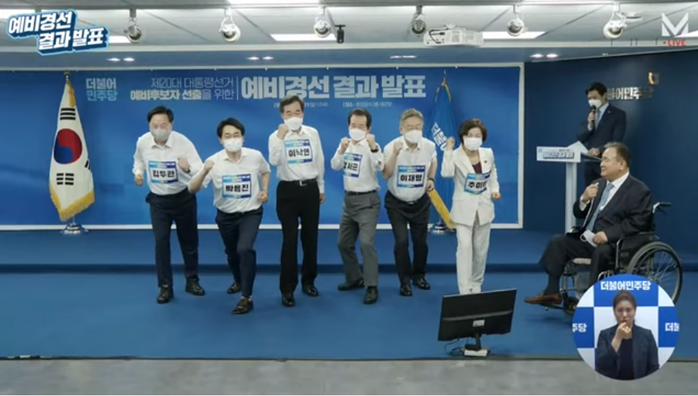 ▲ 11일 오후 더불어민주당 제20대 대통령선거 예비경선 개표식에서 경선 후보로 선출된 추미애(오른쪽부터), 이재명, 정세균, 이낙연, 박용진, 김두관 후보가 이상민 선관위원장(오른쪽)의 휘슬에 맞춰 가슴에 배번호(이름표)를 달고 각자 역동적인 레이스 포즈를 취하고 있다. [사진=유튜브 채널 '델리민주' 캡처] |