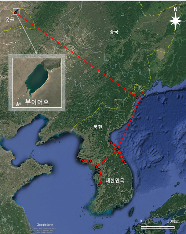 몽골 연구진은 지난해 7월 14일 번식지인 몽골 동부지역 ‘부이어호수’에 사는 혹고니 1마리에 위치추적발신기를 부착했고, 이후 국가철새연구센터 연구진은 위치추적발신기가 부착된 혹고니의 이동 경로를 추적했다.
