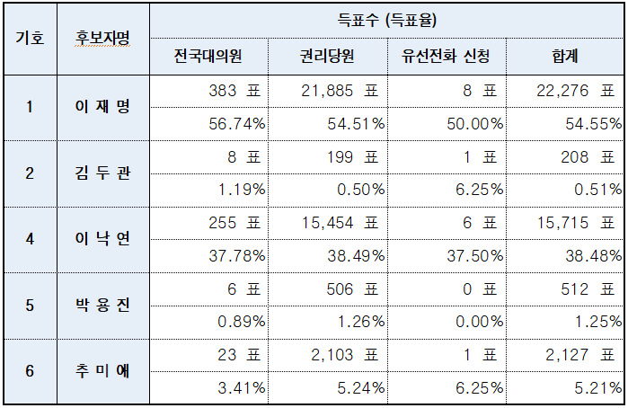 이어 권리당원 투표에서는 추 의원이 5.24%(2103표), 박 의원이 1.26%(506표), 김 의원이 0.50%(199표)를 각각 획득했고, 전국대의원 투표에서는 추 의원이 3.41%(23표), 김 의원 이 1.19%(8표), 박 의원이 0.89%(6표)를 각각 얻었다.
