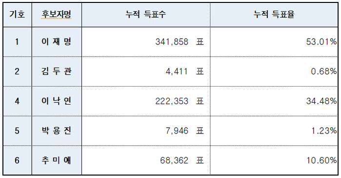 이 전 대표는 34.48%(22만2353표)로 누적 득표율 2위를 달렸고, 추 전 장관이 10.60%(6만8362표)로 3위를 이어갔다. 박 의원은 1.23%(7946표), 김 의원은 0.68%(4411표)를 기록했다.